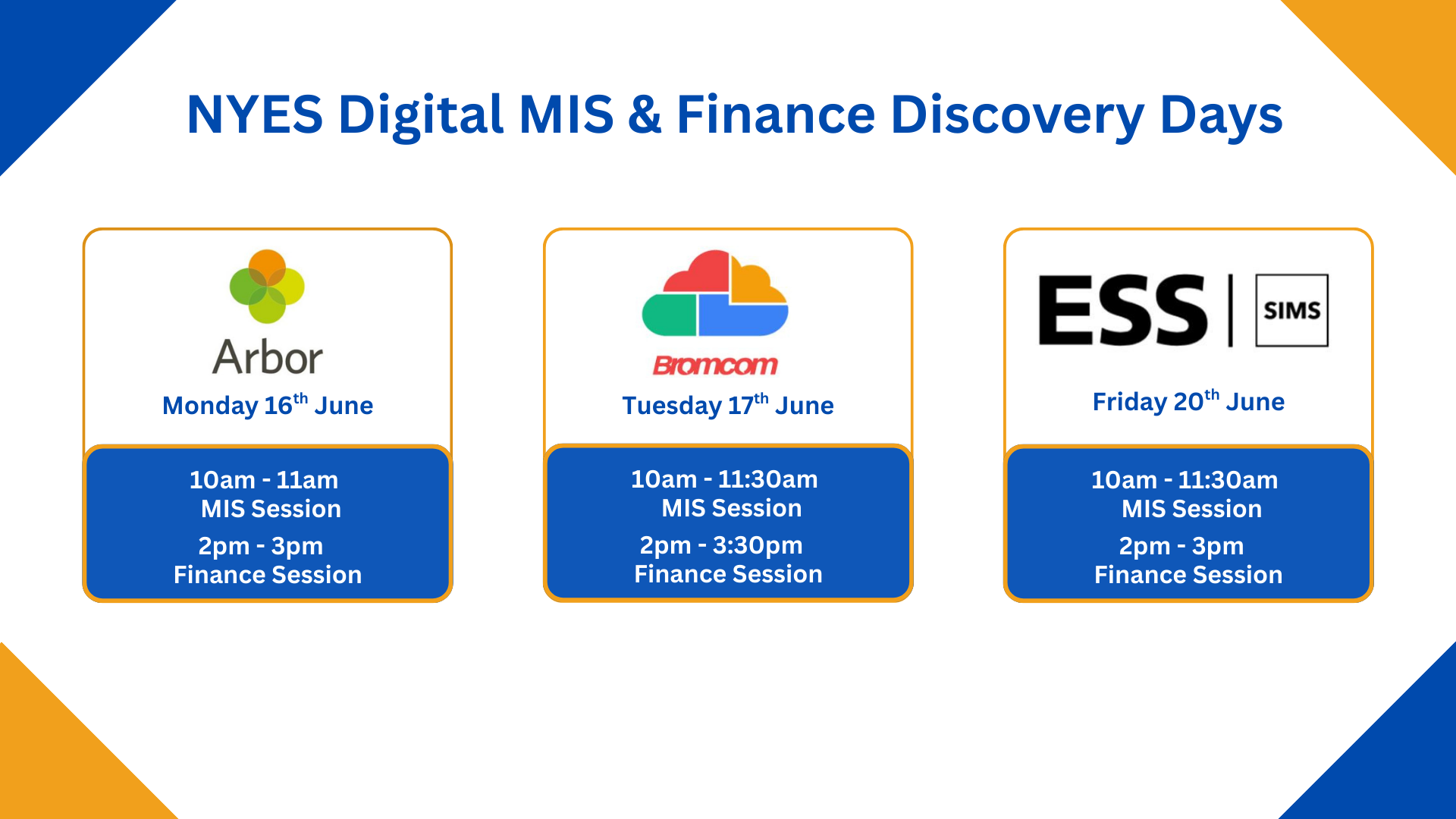 NYES Digital invite you to join us for our MIS & Finance Discovery Days. We will be hosting sessions on Monday 16th June , Tuesday 17th June and Friday 20th June. The suppliers will be showcasing both their MIS and Financial Account Systems (FAS).